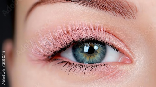 © tugkiara, Obraz premium Close-up of eye with pink eyelash extensions. Beauty, makeup, cosmetic procedure
