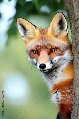 © Andrei, Fototapeta premium close-up of face as it peers from behind tree trunk illuminated by soft dappled sunlight
