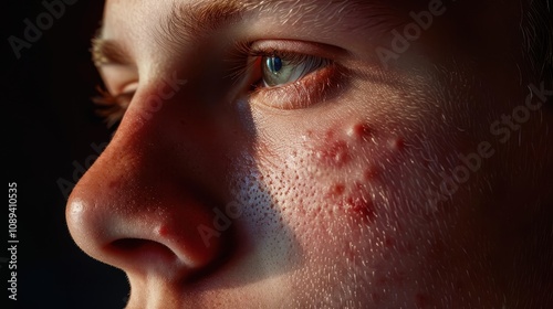 © Exotic Escape, Fototapeta premium Close-up of Face Highlighting Acne Spot with Clear Skin Contrast