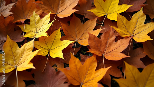Fototapeta premium Close up of fallen leaves on ground in autumn covered in raindrops.