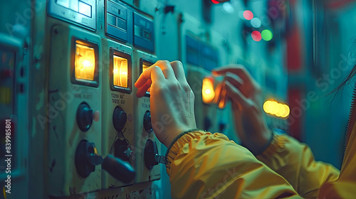 © Graphic Dude, Obraz premium Close up of female hands holding control panel of electric power plant.