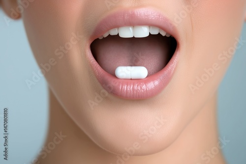 © Matt, Fototapeta premium Close-up of female mouth holding white pill on light blue background