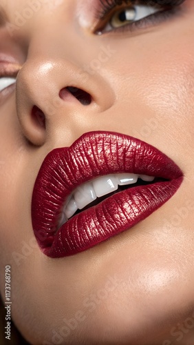 © Diana, Obraz premium Close-up of feminine lips painted with glossy, deep red lipstick. The bold and vibrant shade radiates confidence and luxury, embodying the Cherry Coded 2025 beauty trend.