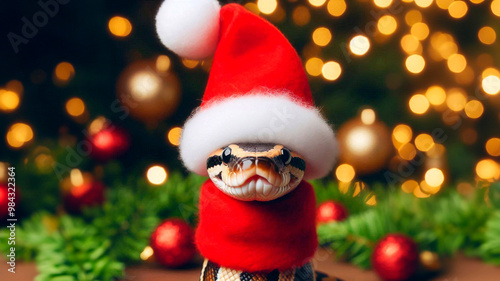 © Cliff, Fototapeta premium Close up of festive snake wearing Santa hat. Christmas and New Year concept