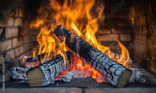 © TheoTheWizard, Fototapeta premium Close-up of fire burning in a brick fireplace, bright embers