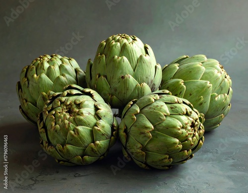 © wan, Obraz premium Close-up of five fresh artichokes on a textured grey surface