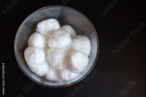 © Erica, Fototapeta premium Close-up of fluffy clean white cotton balls in a clear jar against a dark background with copy space