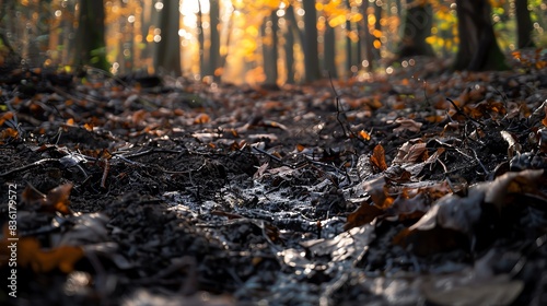 © Pikul, Obraz premium Close-up of forest floor with fallen leaves and sunlight through trees.