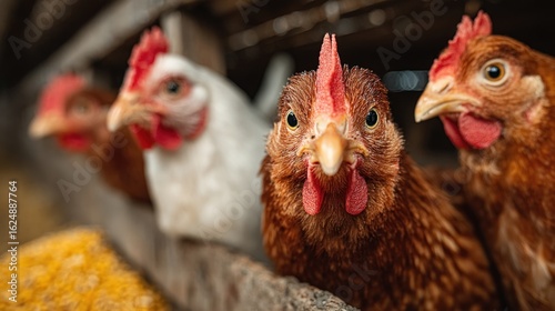 Naklejka premium Close-up of four hens in a coop, focused on three