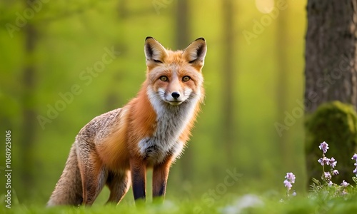 © Alex, Obraz premium close up of fox against the background of blooming green spring forest