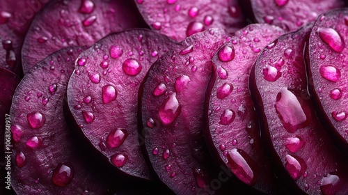 Fototapeta premium Close-up of fresh beetroot slices with glossy water droplets, showcasing...