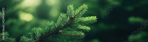 Naklejka premium Close-Up of Fresh Evergreen Pine Branch Against Blurred Green Background