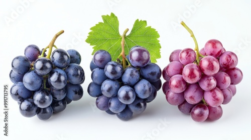 Fototapeta premium Close-up of fresh grapes in three colors with leaves isolated on white background