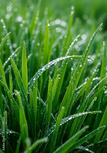 © qawi, Obraz premium Close-up of Fresh Green Grass Blades Covered in Dew Drops