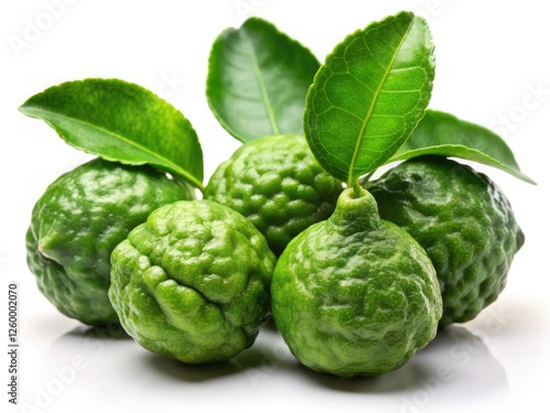 Fototapeta premium Close-up of fresh kaffir lime leaves and fruit, crisp white background.