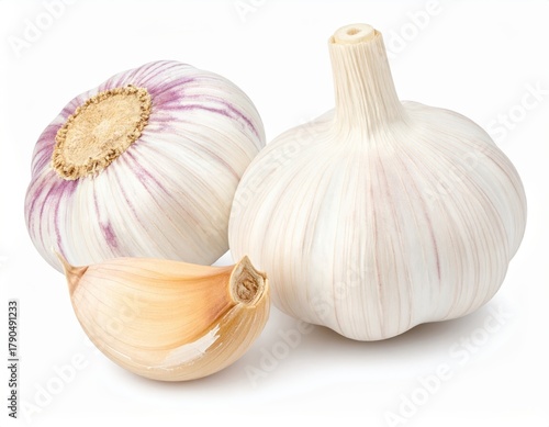 © Sunshine, Obraz premium Close-up of fresh organic garlic bulbs and a clove, showcasing natural texture and color on a white background.