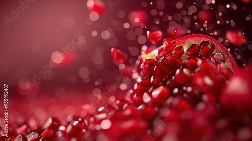 Obraz premium Close-Up of Fresh Pomegranate Seeds with Bokeh Effect on Red Background