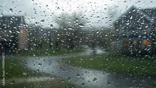 Fototapeta premium Close-up of fresh raindrops on a new double-glazed window, overlooking a private cul-de-sac