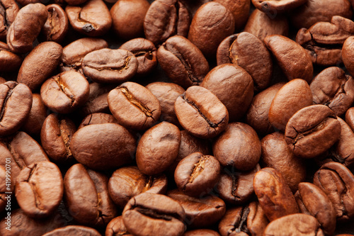 © Boumenjapet, Naklejka premium Close up of fresh, roasted coffee beans. Background, texture or pattern of brown aromatic coffee beans