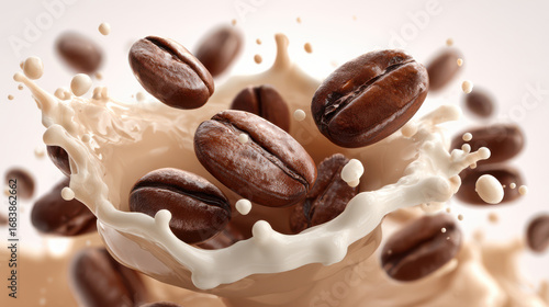 © ink drop, Fototapeta premium Close up of fresh roasted coffee beans with liquid splash