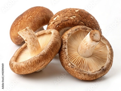 Fototapeta premium "Close-up of fresh shiitake mushrooms on a white background, showing detailed...