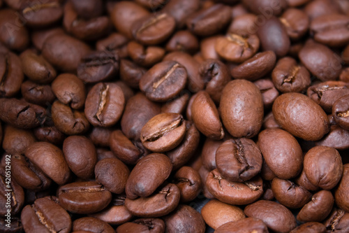 Fototapeta premium close up of Freshly roasted coffee beans background. top view