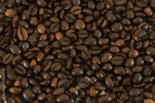 Naklejka premium Close-up of freshly roasted coffee beans piled on a wooden table, creating a...
