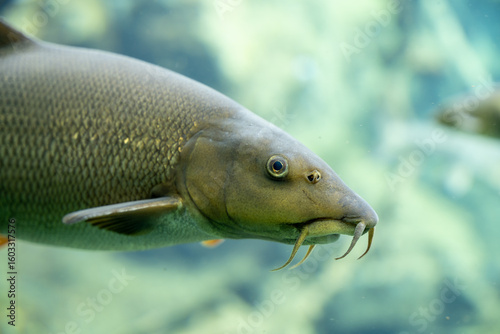 Fototapeta premium Close-Up of Freshwater Barbel Fish Head | Detailed Underwater Portrait with Distinctive Barbels and Golden Scales