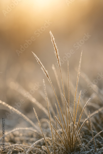 Fototapeta premium Close-up of frosty grass illuminated by warm sunlight