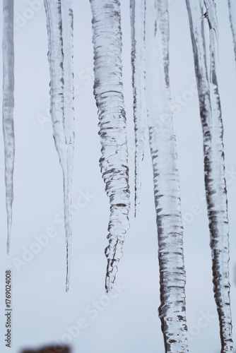 © alexkich, Fototapeta premium Close-up of Frozen Icicles Against a Winter Sky
