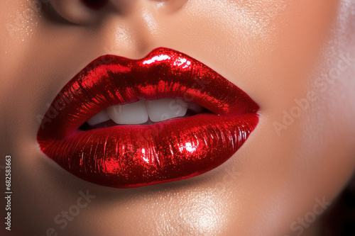 Fototapeta premium Close-up of full lips with vibrant red lipstick