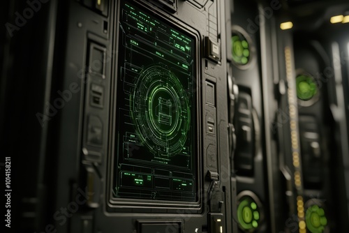 Fototapeta premium Close-up of futuristic digital interface displayed on advanced technology panel, illuminated with vibrant green graphics, showcasing high-tech design.