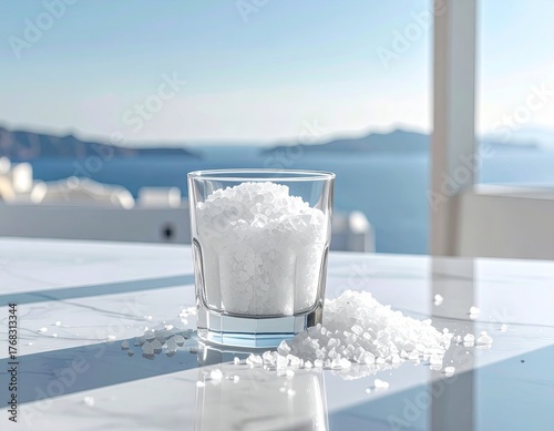 © Trukune, Naklejka premium Close Up of Glass Filled with White Crystalline Substance on a Marble Table against Blurred Sea View
