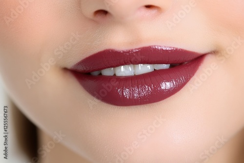© Yulia, Fototapeta premium Close-up of glossy burgundy lips with subtle makeup and smooth skin