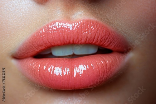Obraz premium Close-up of glossy coral pink lips slightly parted revealing front teeth with...
