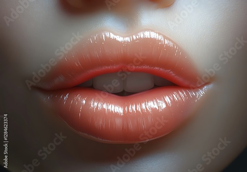 © MicroTech, Obraz premium Close-Up of Glossy Peach-Tinted Lips with Hint of White Teeth