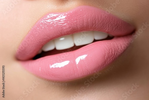 Obraz premium Close-up of glossy pink lips with smooth texture and natural smile