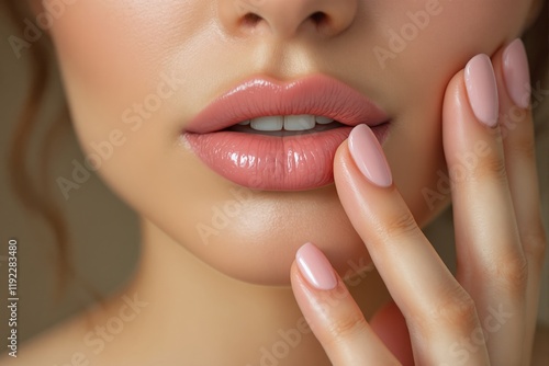 Obraz premium Close-up of glossy pink lips with soft skin and manicured fingers on a...