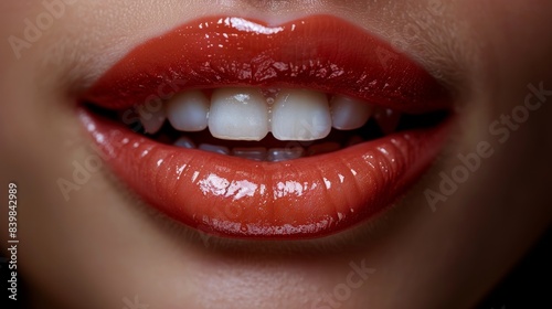 Obraz premium Close-up of glossy red lips and white teeth, showcasing a vibrant and...