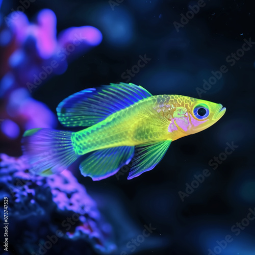 Fototapeta premium close up of glowing aquarium fish in tank water under fluorescen