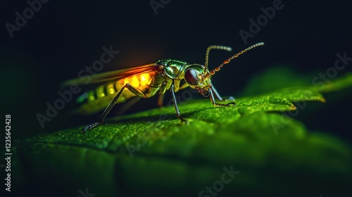 © Kitta Studio, Fototapeta premium Close-up of Glowing Insect on Leaf at Night in Nature's Environment