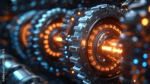 Fototapeta premium Close-up of glowing mechanical gears with blue and orange lights, showcasing...