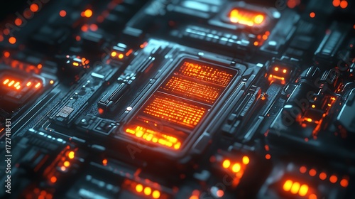 © NAHID, Obraz premium Close up of glowing orange circuit board components isolated on white background