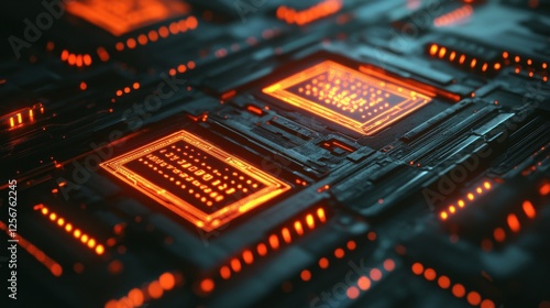 © SepazWorks, Fototapeta premium Close-up of Glowing Quantum Chip with Binary Hologr