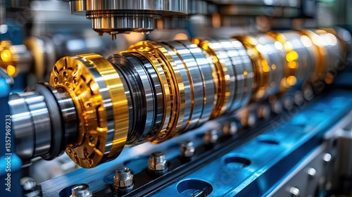 Fototapeta premium Close-up of gold and silver industrial parts during manufacturing process. Illustrates precision engineering, automation, and high-tech manufacturing.