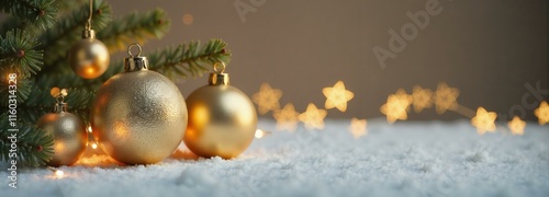 Fototapeta premium Close-up of gold Christmas tree ornaments and pine needles on snow with star...