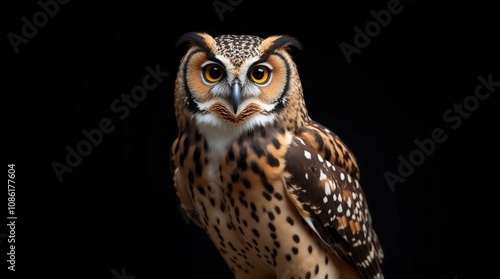 © Caspernik, Naklejka premium Close-Up of Great Spotted Owl on Black Background Detailed View of Bubo Bubo