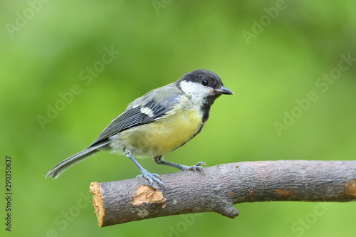 © Pavol Klimek, Naklejka premium Close up of great tit with sunflower in the beak in garden