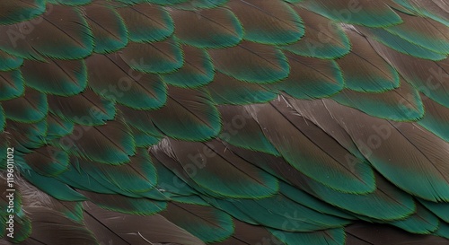 © Kamal, Fototapeta premium Close-Up of Green and Brown Bird Feathers Texture