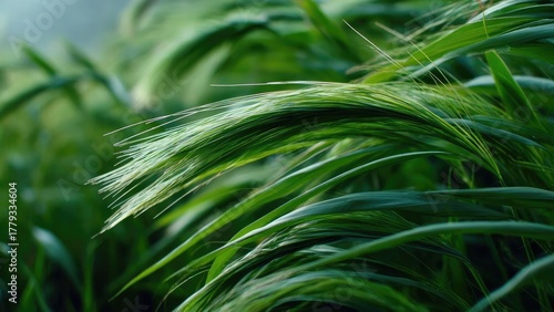 © Anastasiia, Naklejka premium Close-up of green barley plants with long awns arching over in a field. Concept Close-up of barley, green barley plants, long awns, field texture, agricultural macro